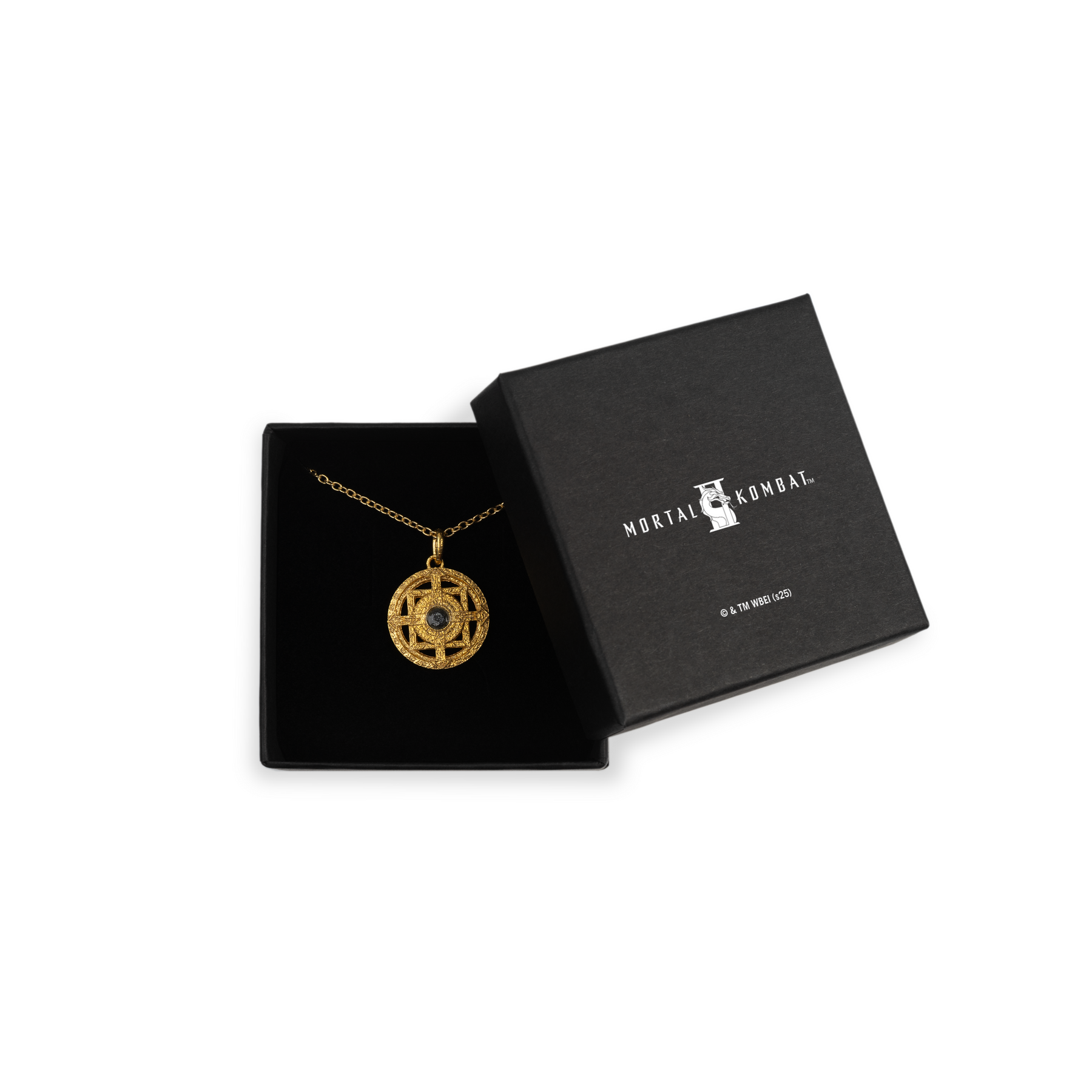 Tap into ancient magic with the Amulet of Shinnok 24k Gold-Plated Sterling Silver Necklace. The 24k gold-plated over 925 Sterling silver necklace features a detailed replica of the powerful amulet, a central piece of lore in the Mortal Kombat universe. Delivered in a Mortal Kombat II-branded jewelry box with a Certificate of Authenticity, the amulet’s design is a direct nod to Mortal Kombat’s deeper mythology, making it a must-have for fans who appreciate its rich and sinister history.