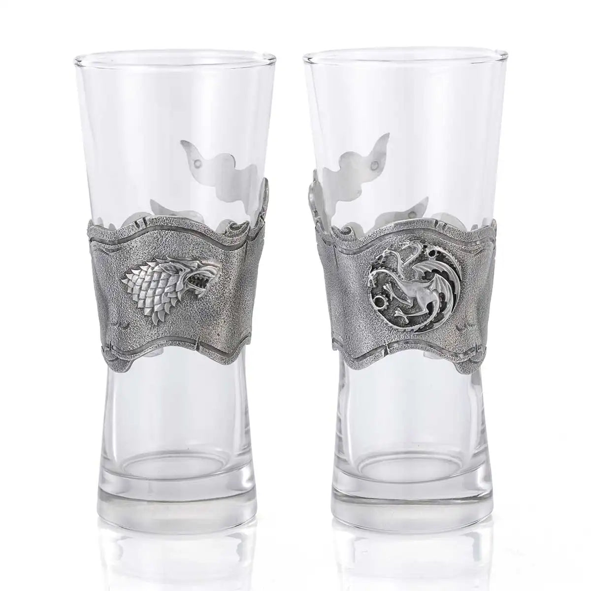 Fine pewter banners announcing Houses Stark and Targaryen unfurl around a pair of glass pilsners. Winterfell’s direwolf sculpted on one, Dragonstone's three-headed dragon on the other, these pilsners are perfect for Game of Thrones and Westeros fans.