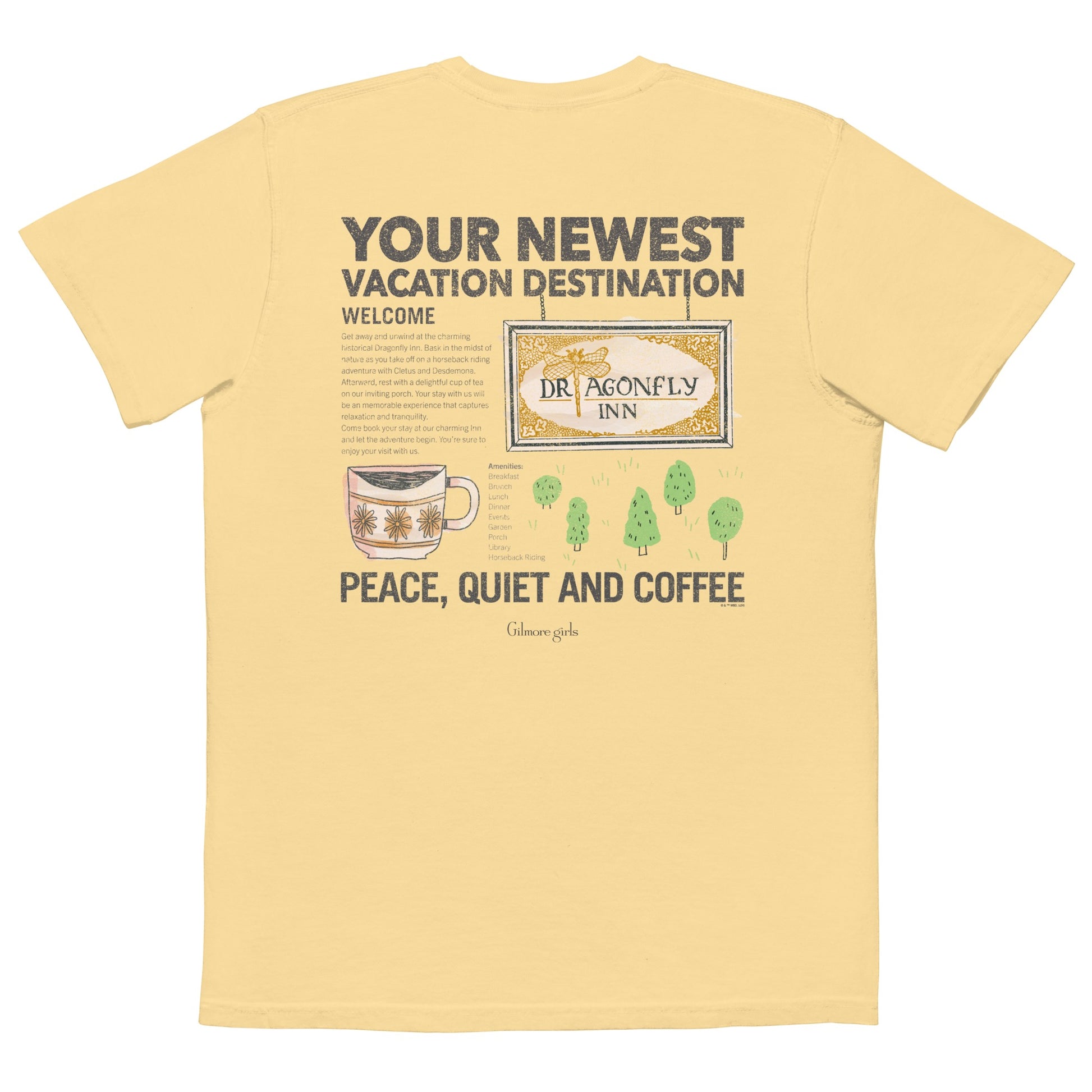 Celebrate the magic of Stars Hollow and beyond with our Gilmore Girls Dragonfly Inn Destination Comfort Colors T-shirt. Infused with the spirit of Lorelai and Rory's adventures, this t-shirt seamlessly combines the quaint charm of the Dragonfly Inn with a modern twist! Slip into this shirt and relive the joy of coffee-fueled conversations and small-town camaraderie with every wear.